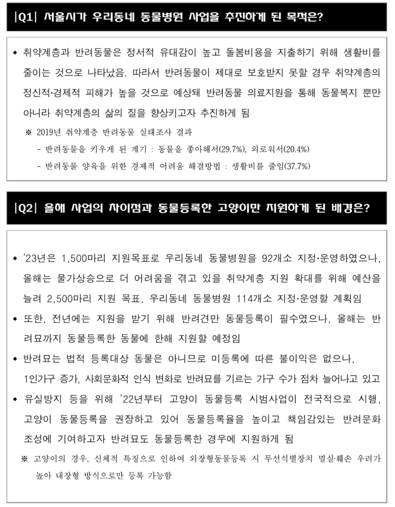 서울시는 반려동물을 양육하는 취약계층의 경우 평상시 양육비뿐 아니라 반려동물이 아플 때 지출해야 하는 진료비에 대한 부담이 커 이를 완화하기 위해 ‘우리동네 동물병원’ 사업을 시작했습니다.
