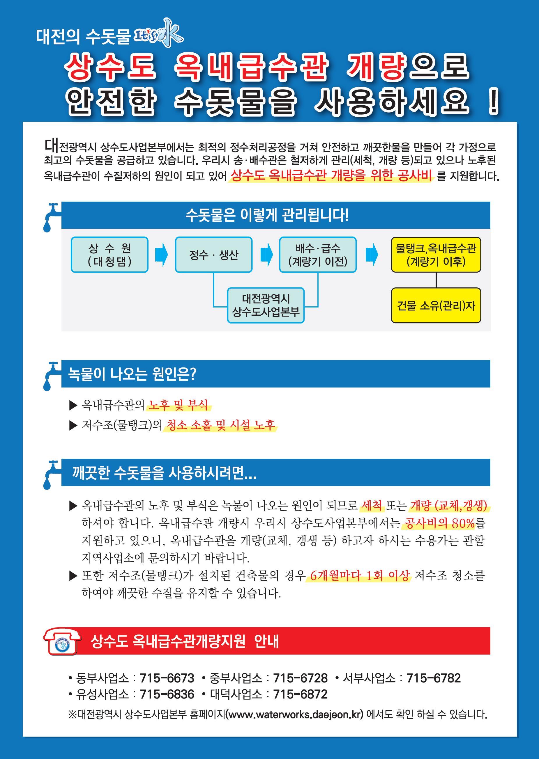 대전 노후 옥내급수관 개량 및 옥상 물탱크 철거 비용 지원을 희망하는 건물 소유자는 대전시 상수도사업본부 홈페이지(www.waterworks.daejeon.kr)에서 신청서를 내려받아 작성하여 관할 사업소로 신청하면 되며 담당 공무원의 현지 확인 및 승인 절차를 거쳐 공사 완료 후 지원금이 지급된다고 합니다.
