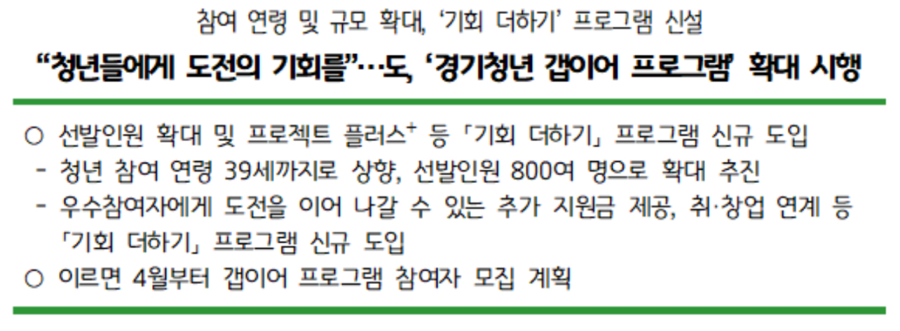 ‘경기청년 갭이어 프로그램’ 이후 도전을 이어 나갈 수 있도록 ‘기회 더하기’ 프로그램을 신규 도입한다고 합니다.