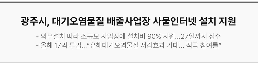 광주광역시 대기오염물질 배출사업장 사물인터넷 설치 지원 신청에 대해서 알아보겠습니다. 광주시가 소규모 대기오염물질 배출사업장에 사물인터넷(IoT) 설치를 지원, 대기질 향상에 나선다고 밝혔습니다.
