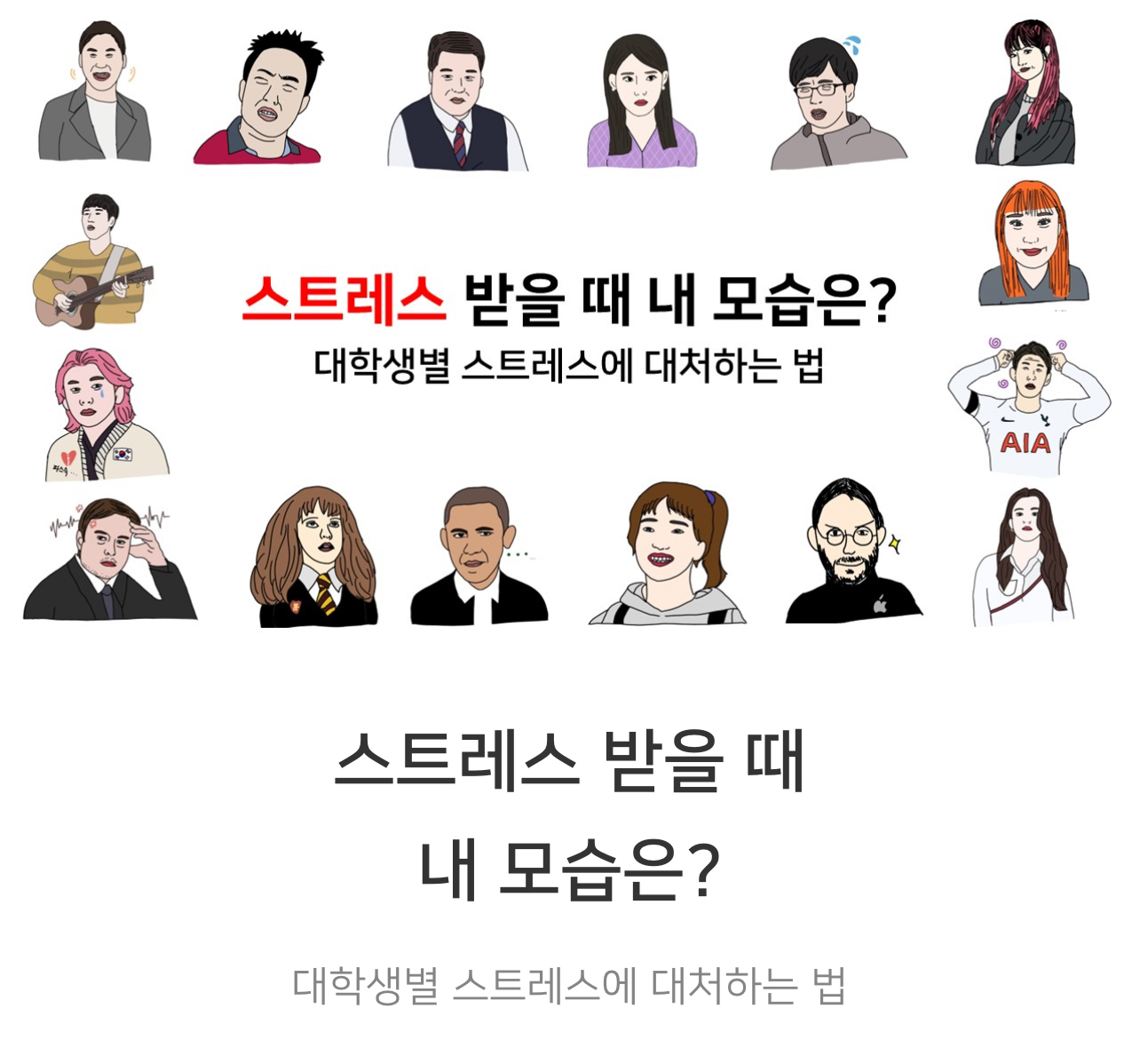 '대학생별 스트레스에 대처하는 법'은 YMH컨소시움에서 청년멘탈헬스케어와 관련하여 기획, 제작된 테스트입니다. 스트레스 받을 때 나는 어떤 캐릭터와 비슷할까요? 간단한 테스트를 통해 성격