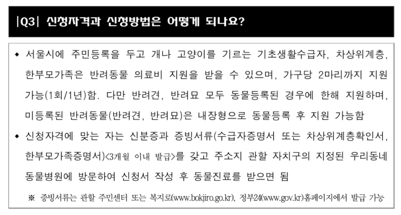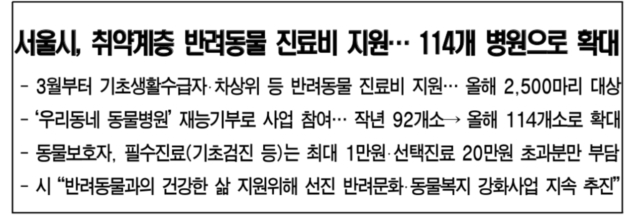 서울시는 반려동물을 양육하는 취약계층의 경우 평상시 양육비뿐 아니라 반려동물이 아플 때 지출해야 하는 진료비에 대한 부담이 커 이를 완화하기 위해 ‘우리동네 동물병원’ 사업을 시작했습니다.