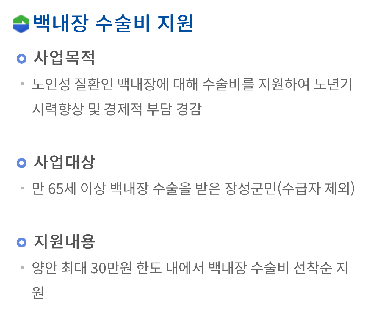 장성군 노인 백내장 수술비 지원 신청 지원 대상은 65세 이상 장성군민으로 올해 백내장 수술을 받은 사람에 한해 안(眼)당 15만원씩 최대 30만원을 지원한다고 합니다.