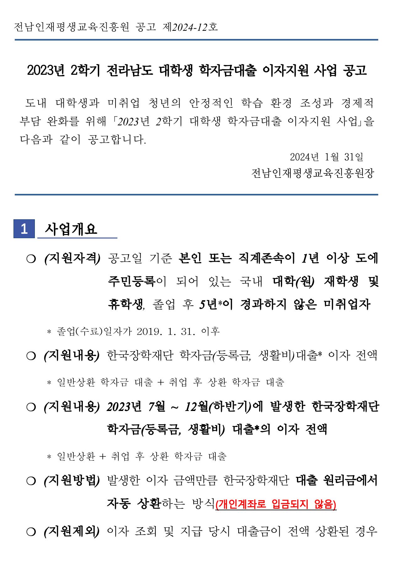 전라남도 대학생 학자금대출 이자지원 신청방법에 대해서 정리하겠습니다. 전남인재평생교육진흥원에 따르면 대학생들의 경제적 부담을 완화하고 학업에 전념할 수 있는 안정적인 환경 조성을 위한 「2023년 1학기 대학생 학자금대출 이자지원 사업」을 다음과 같이 공지한다고 밝혔습니다.