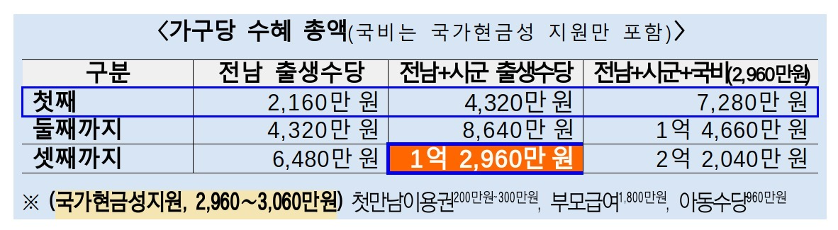 전라남도와 시군 출생수당을 함께 받으면 18년간 한 명당 총 지원액은 4천320만 원에 이르는데 두 자녀 가구는 8천600만 원, 세 자녀 가구는 1억 3천만 원까지 지원받을 수 있어 실제 양육 부담을 크게 덜게 될 것으로 보인다고 합니다.