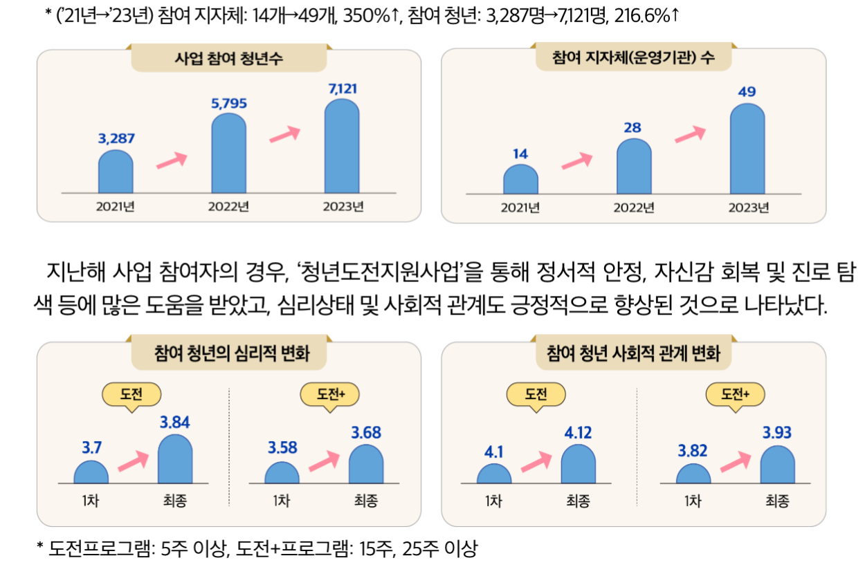 2021년 시범 도입 이후, 지원에 대한 사회적 공감대가 높아짐에 따라 참여 자치단체가 지속 증가해 왔으며 지난해 프로그램 다양화 등에 힘입어 참여 청년 등 사업 규모가 큰 폭으로 증가하여 사업이 본궤도에 올랐다고 합니다.